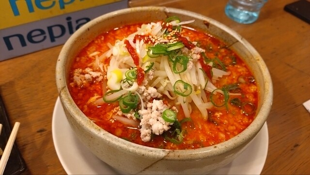 特製の激辛肉味噌が入った熱々の石焼鍋に、スープをレンゲで4~5杯。