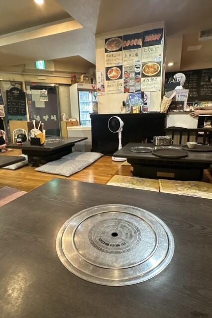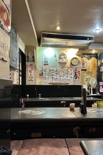 店内は昭和の趣を残すレトロな雰囲気。団体客でにぎわいながらも、一人焼肉を楽しむ常連客の姿もあり、どこかホッと落ち着ける空間です。