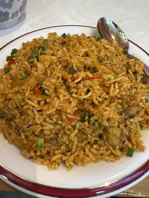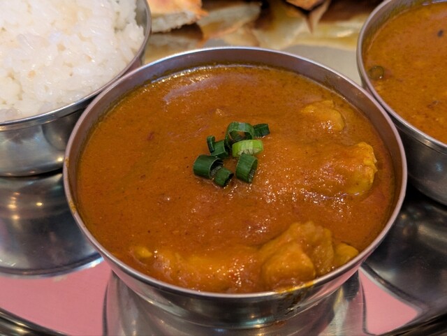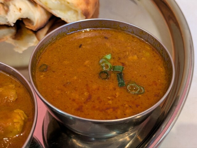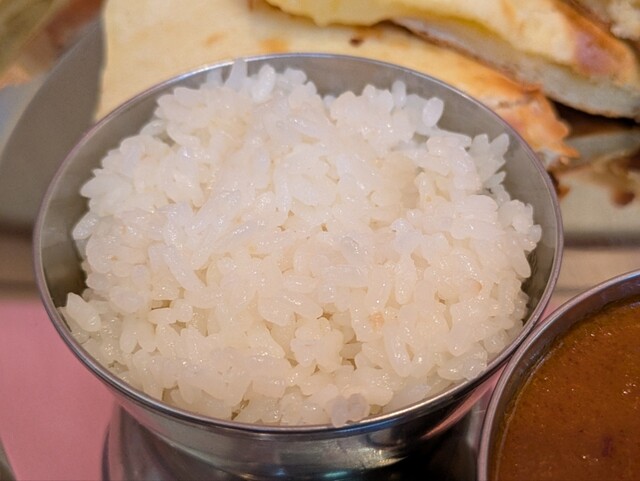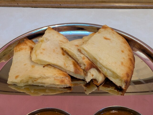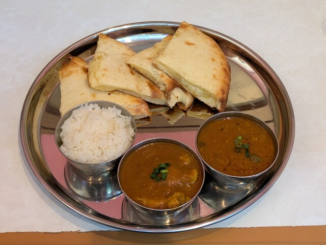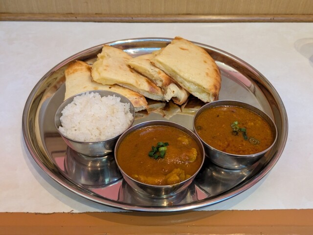 本日の注文はチーズナンセット(カレー2種)。キーマカレーとチキンカレー(ともに中辛)、チーズナンとライス。2種のカレーもチーズナンもけっこう美味しい感じです。中辛の辛さも、辛さを味わいながら美味で、僕にはちょうど良かったです。