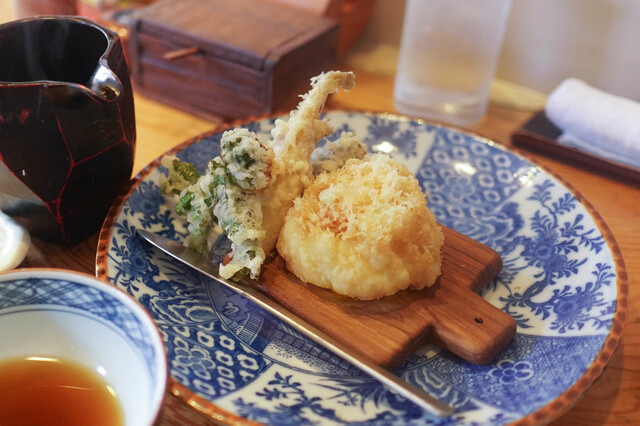 平日13時20分、外での待ちは4人程度。 25分待ちで入店できました。店内の雰囲気が落ち着いていますね。 平日限定メニューで天付きもり¥2000をお願いしました。まずは雲呑の皮をカラッと揚げたような塩味の効いたお通しが出てまいりました。サクサクしていて軽くて、ビールによく合いそうです。 次に天... 詳細を見る