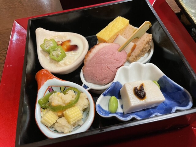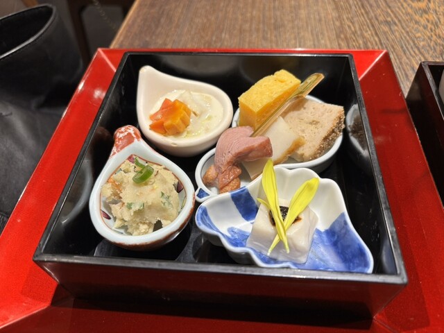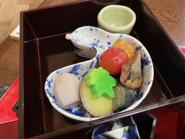 続いて、和食でいうところの酒の肴となる、口取りの一段目は、里芋、サツマイモ、茄子等の煮物。。。変わり種でプチトマトも入ってますが、上品な味付けはさすがといった感じ。。。