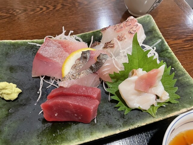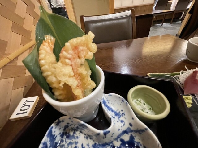 今日は、豪華にお造り5点盛りを付けたセットをお願いしました。。・