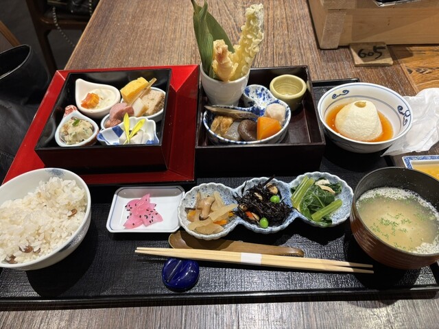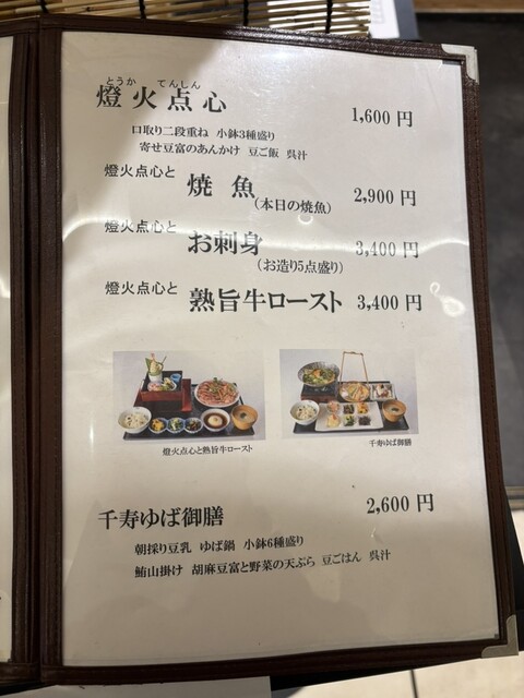 メインの食事ですが、口取り2段重ねに小鉢3種盛り合わせ、さらに寄せ豆腐のあんかけ、豆ご飯、呉汁までつく豪華なセットメニュー” 燈火点心”が、ランチの基本メニューの様子。。。