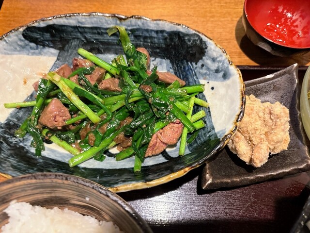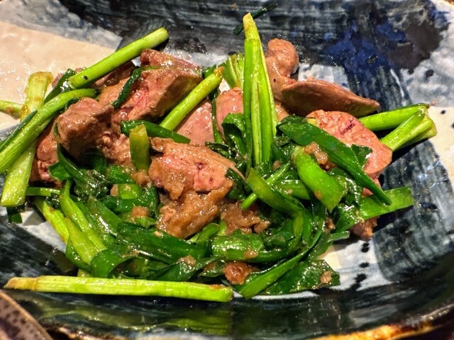 究極のレバにら半分と鶏のから揚げ三個1200円、ハートランド(中びん)800円注文。