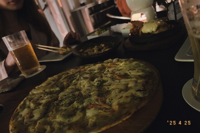 料理はラクレットチーズ唐揚げ、蟹味噌ピザ、いくらカルボナーラ、味はとても美味しかっ...
