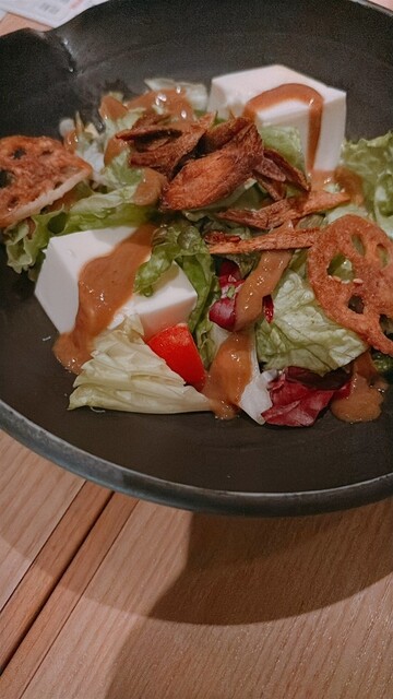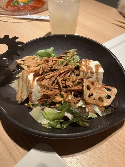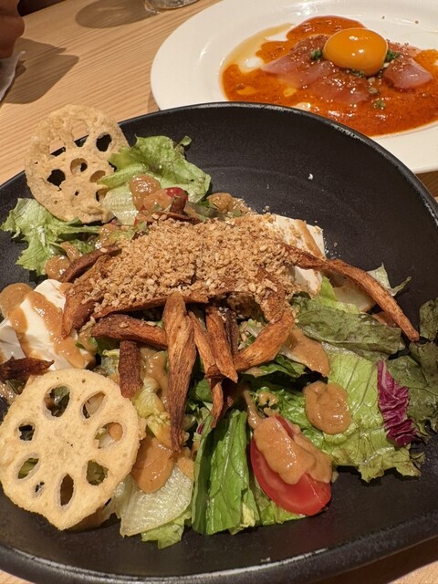 鮪ユッケカルパッチョは黄身を混ぜて濃厚、サラダは豆腐や牛蒡が入ってて胡麻を自分で擦るのが楽...