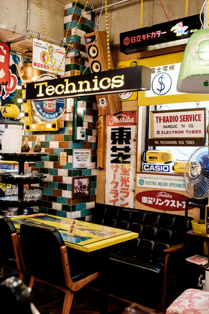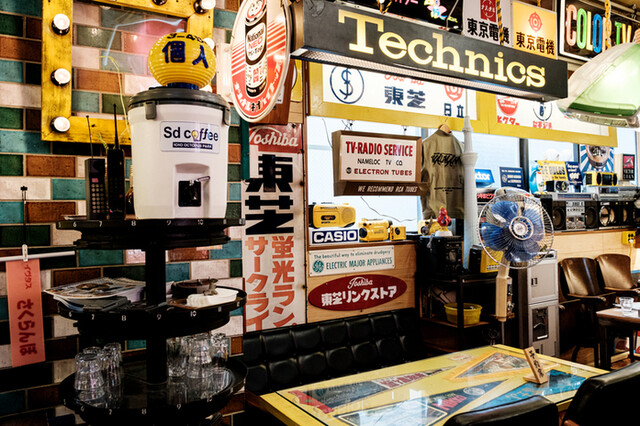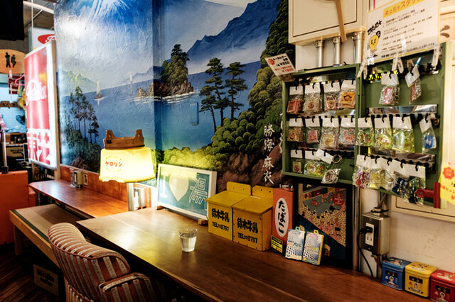 昭和レトロな銭湯や雑貨屋が融合したような空間が特徴のカフェです。店内には銭湯絵師による大きな富士山の絵や、ケロリン桶、ゲーム筐体などが置かれ、まるでおもちゃ箱のようなワクワクする雰囲気を楽しめます。