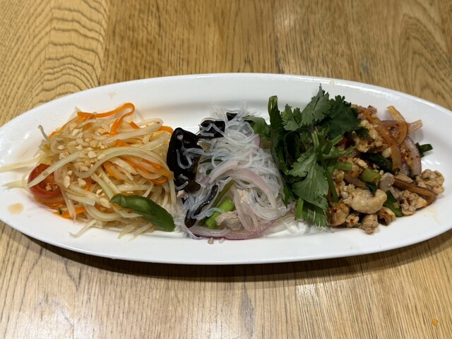 【平日夜 北千住ルミネ】 ひとくちタイサラダ三種盛り 600円 (ヤムウンセン・ソムタム・ラープガイ) 鶏肉あんかけごはん(カオナーガイ)1200円 北千住ルミネ8Fレ... 詳細を見る