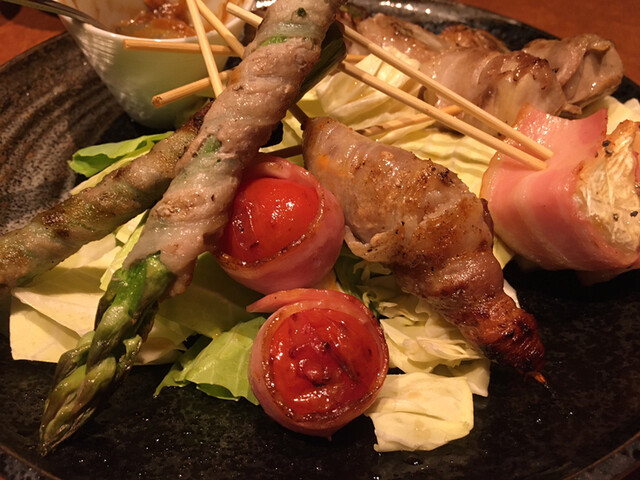 プチトマト巻き串にアスパラ一本巻き串、博多明太1本串