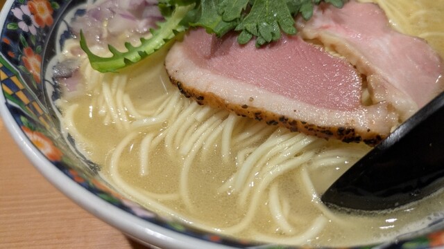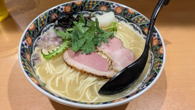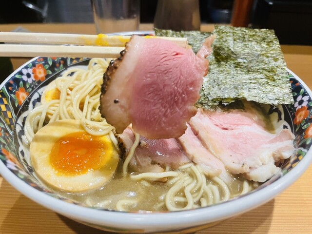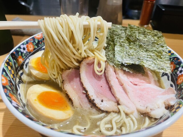 北千住の駅前にあります。店内は狭いですが、木の温かみがある店内です。入り口の券売機の左上メニューの特選煮干中華蕎麦1,250円の食券を買いました。店内はカウンターのみで半分ほど埋まっていました。 スープ:煮干しのうま味が感じられるおいしいスープです 麺:細めのストレート麺でシコシコ感がありお... 詳細を見る