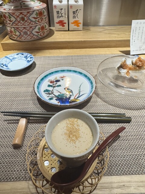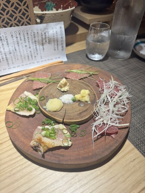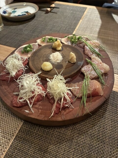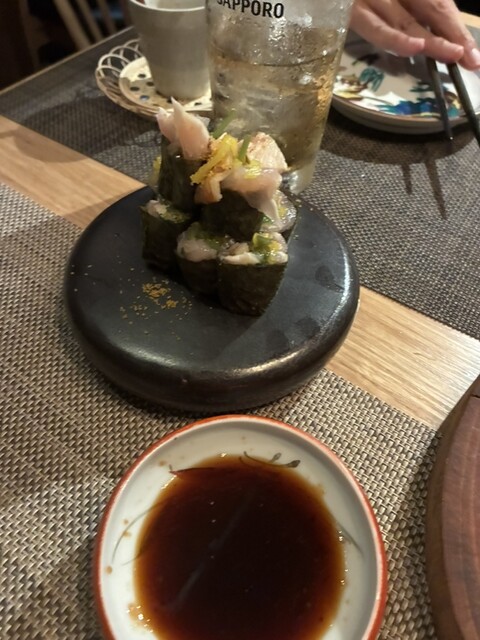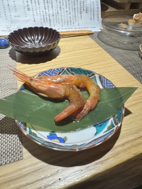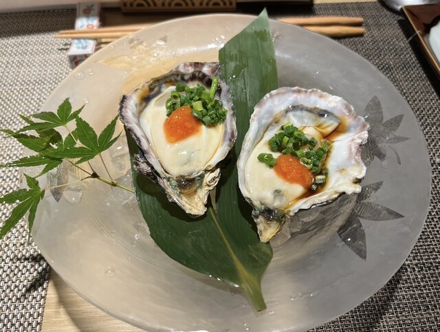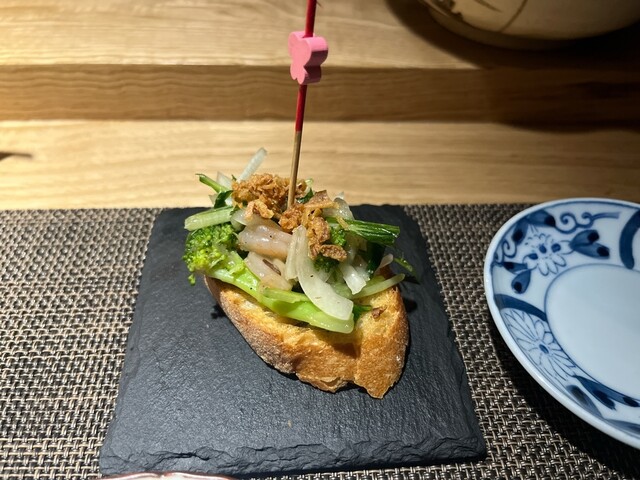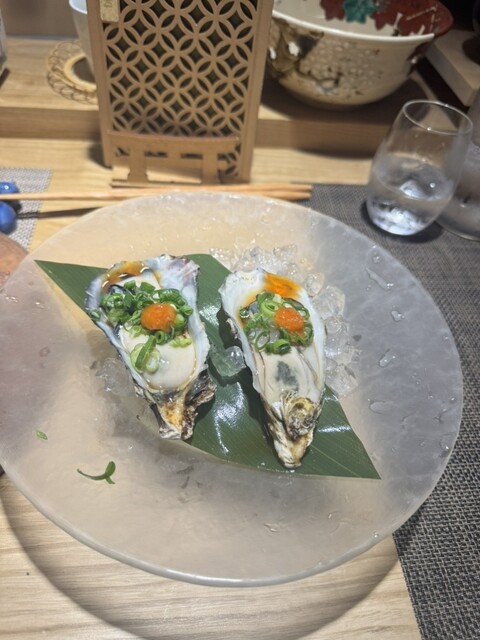 2名で訪問。貝と魚と炉ばたのばんびを予約しようとした所、満席との事で系列店のこのお店を紹介されました。ばんびと同じビルの2階にありますが、1階でイノシシ柄のインターホンを鳴らして、お店に入ります。看板も何も無いですが、扉を開けるとオシャレな空間があります。カウンター8席と1テーブルの小ぢんまりとしたお店ですが、それが心地よい雰囲気を出しています。