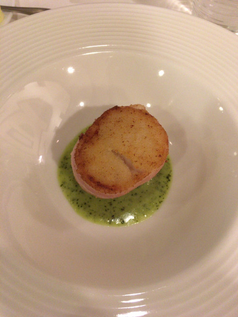 前菜1皿目、さっと焼いたホタテとアスパラのハーブオイル。