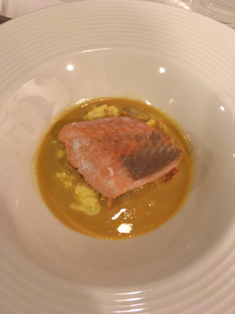 メイン1、サーモンとスクランブルエッグ、タラバ蟹のビスクソース。