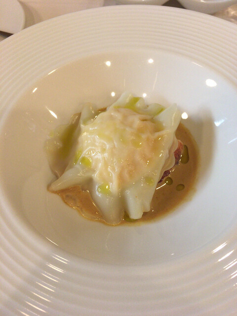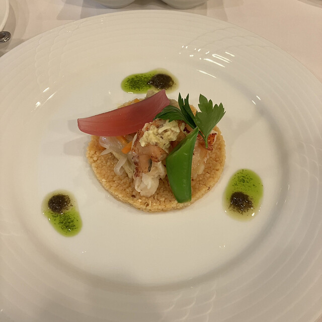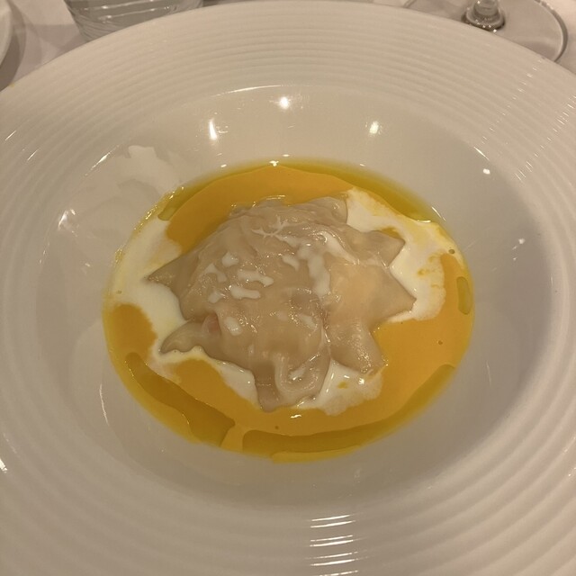 メイン1皿目、オマールのソテーとオマールのラビオリ、ビスク風ソース。