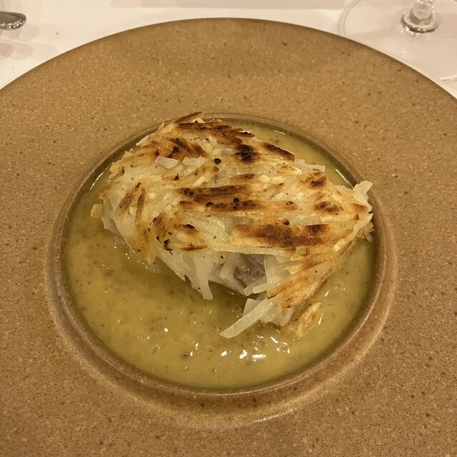 コースのアクセントとしてちょっとした1皿、鱈のスモークとジャガイモのリエット。