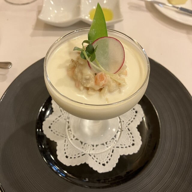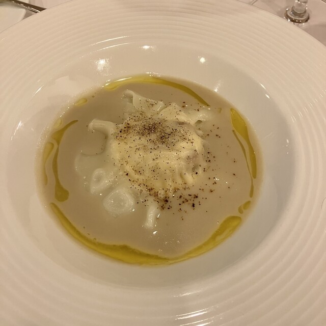 ②フォアグラ入りラビオリが浮いたマイタケポタージュ