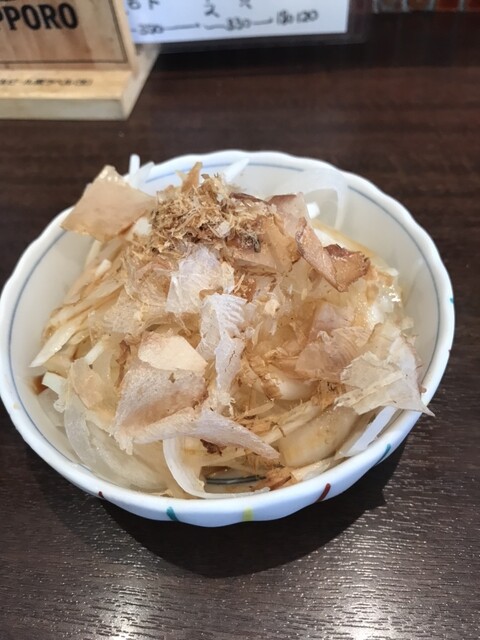 つまみは淡路島産のオニオンスライスとハツ刺し。淡路島産の玉...