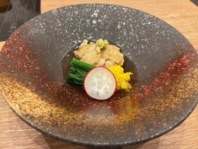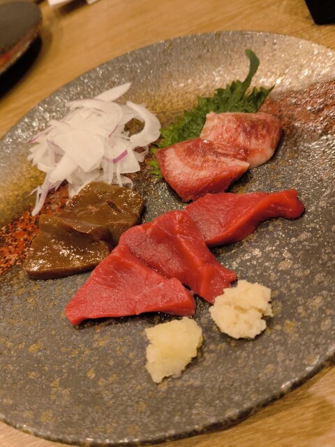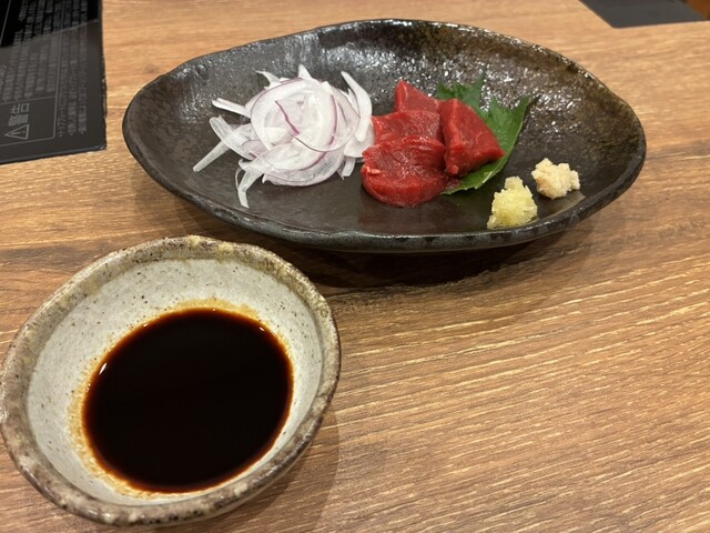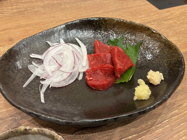 午後5時45分ごろ、同行者2名計3名で訪問しました。 4人がけテーブル席を確保しました。 牡蠣なども入ったお通しは、充実しています。 馬刺し 2,00円、馬レバー刺し... 詳細を見る