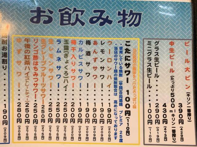| ドリンク | 日本酒あり、焼酎あり |