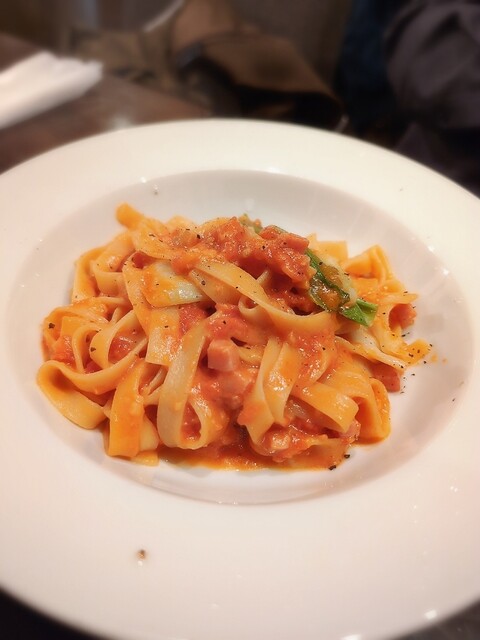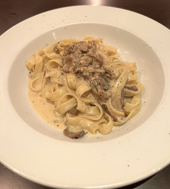 古民家を改装した隠れ家的お店。店内はジャズが流れていて照明は暗めの白熱球で落ち着ける雰囲気がとても良い。生ハムとルッコラのサラダ、ポルチーニ茸のクリームソース(フェットチーネ)を注文。ドリンクはジンジ...