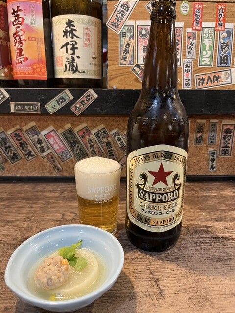赤星瓶ビール、お通しは、大根とつくねのおでん風な煮物で乾杯!