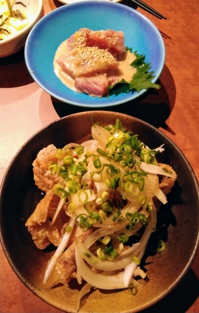 マグロのぬた、鶏皮ポン酢、いぶりがっこクリームチーズ、梅水晶など...、とりあえずいろいろ頂きました。