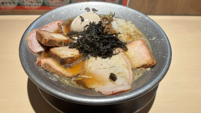 煮干し・乾物・豚骨の効いた醬油ベースのスープで、背脂の甘みと柚子香る美味しい一杯をお届けします。麵は手もみ麵でぷりぷりの食感が◎背脂は標準~大油まで調節可能なので、こってり味がお好きな方にもおすすめです!大判でしっとりとしたチャーシュー、岩のり、玉ねぎなどトッピングも充実!「まかない丼」や「のり茶めし」と、ラーメンのお供にぴったりな一品もご用意♪店内は全席カウンターのみ!ぜひ気軽にお越しください。