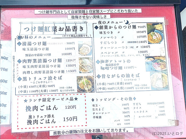 休日11時半、国分寺駅からほど近い「自家製麺つけ麺 紅葉」に到着すると、すでに店内は満席。10分ほど待ち時間を過ごす間、期待がどんどん膨らんでいきます。店内は清潔感があり、壁にはスープや麺へのこだわり...