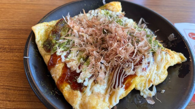 豚肉を包んだ薄焼き卵にかかるは、濃厚ソースにマヨネーズ。