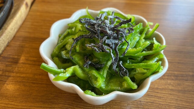 「おつまみピーマン」330円は、ピーマンに塩昆布が乗っただけのシンプルな物。