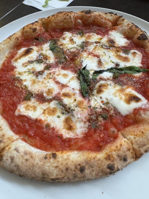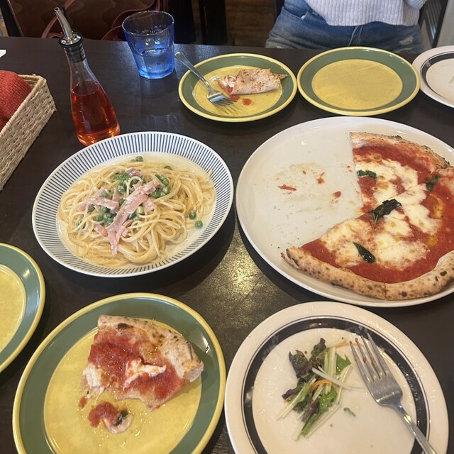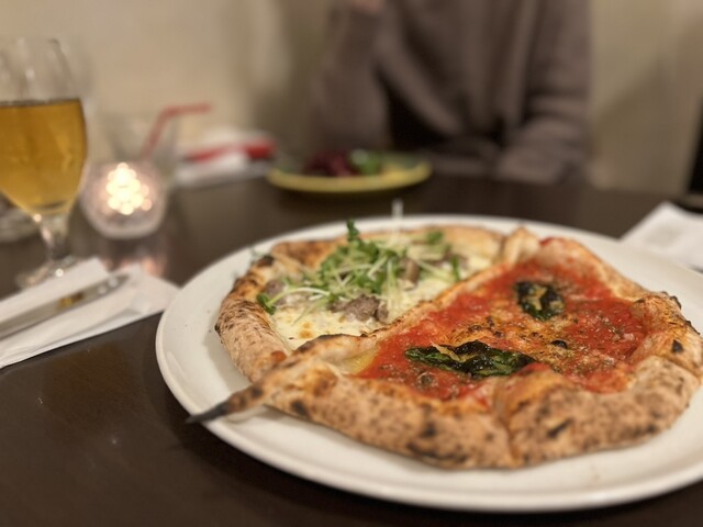 先ずはピザ、本日のオススメと定番のマリナーラのハーフハーフで。他にもラザニア、サラダ、ドルチェのプレートをクーポンでメッセージ...