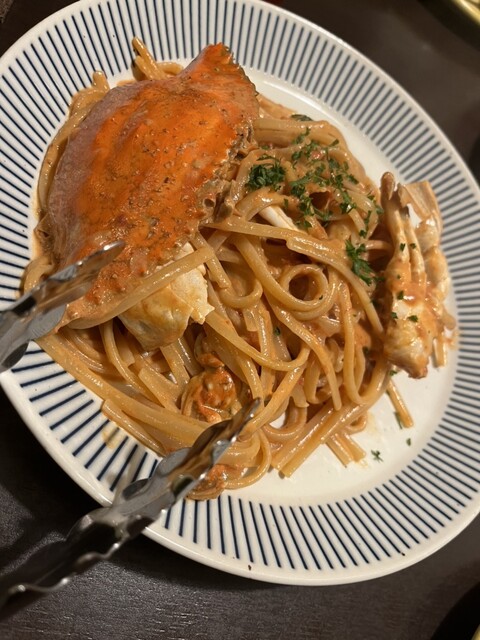 濃厚ながら後味は軽やか、豊かな蟹の旨味が平たい麺としっかり絡み、トマトの酸味が全体を引き...