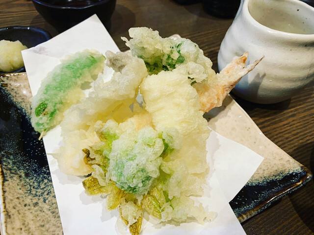 春の天ぷらせいろ(1650円)を注文。内容は、海老、イカ、ワカサギ、新玉葱、ふきのとう、うるい、新レンコンと書いてあった。