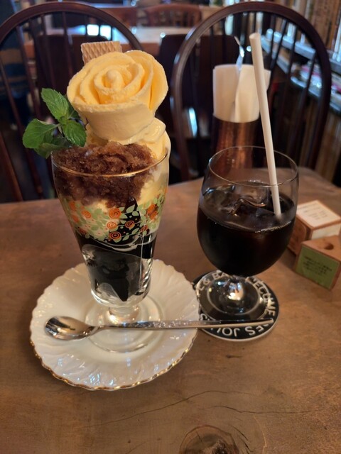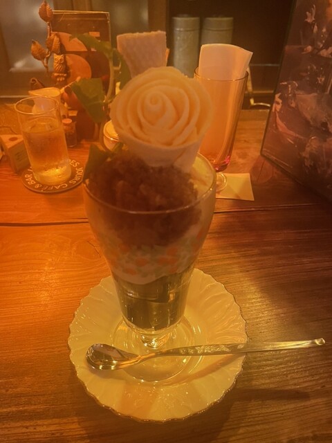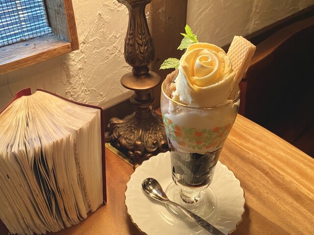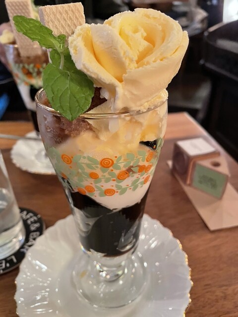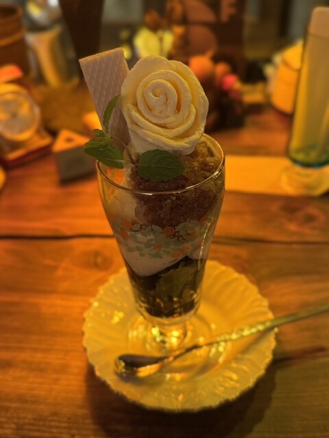 パフェは濃厚なバニラアイスが花の形に盛られていて見た目も華やか。やわらかく口どけも良いです。ウエハースが添えられていて...