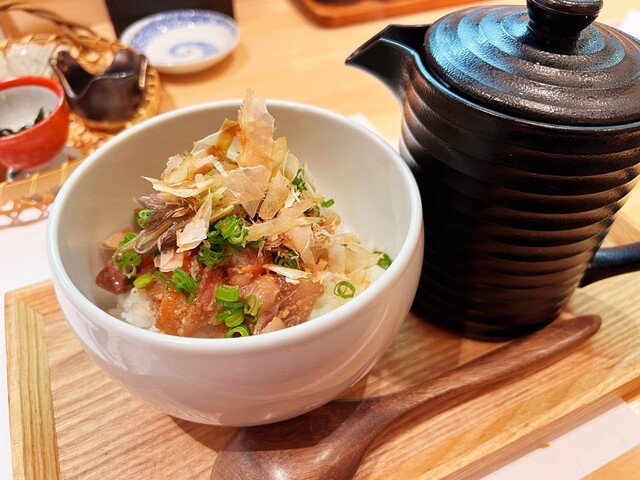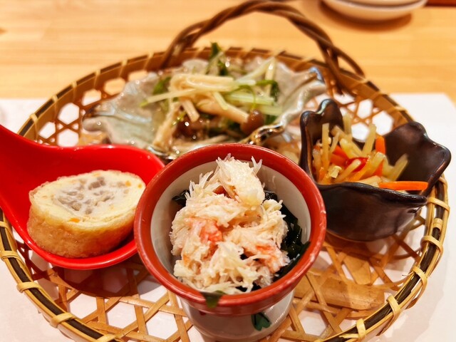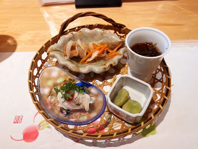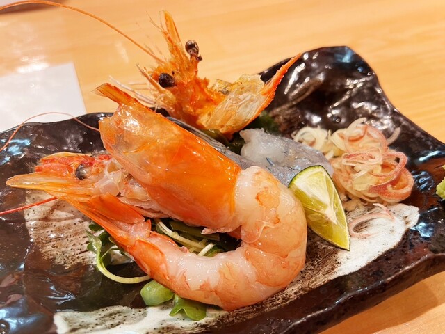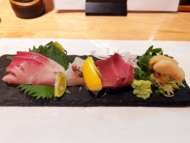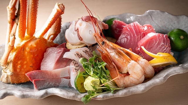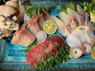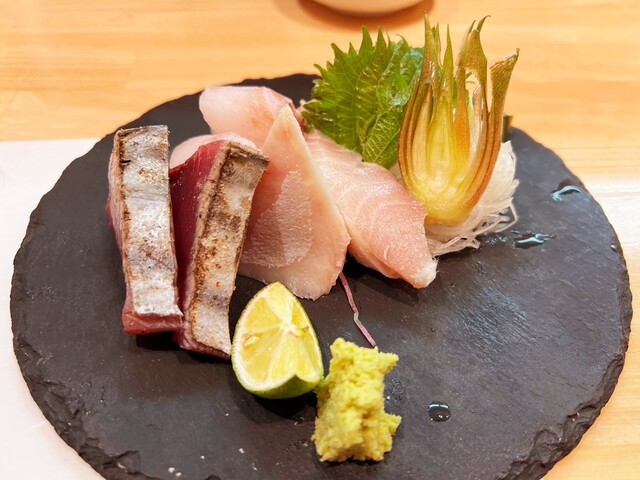 ・深海からの贈り物のような、ブリ、サワラ、カツオの刺身が添えられた、驚きに満ち...