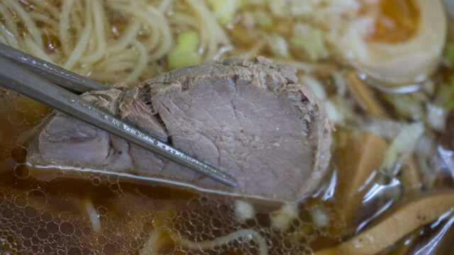チャーシューは一枚だけど、2枚が重なってるように切り跡が入ってて、