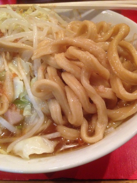 府中の特筆は何と言っても、その圧倒的存在感を誇る「剛麺」でしょう。見た目は、まんまウドンなんですが、およそ「きしめん」の倍はありそうな迫力、この取り捨てで府中の好みも極端に分かれるでしょうね。MGには太過ぎる・・・というか、あの半分の太さでも、十二分に麺の存在感は感じられます。そこにはMGの好きな「啜り込む楽しさ」が、完全に無視されてしまっています。MGは日本蕎麦が好きですが、その美味しさの一要素は、蕎麦猪口からズルズル音を立て啜り込む、あの食べ心地だと思っています。もちろん、日本蕎麦と二郎(府中二郎)を、同じ土俵で取らせるのは?ですけど(笑)