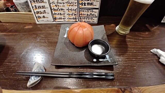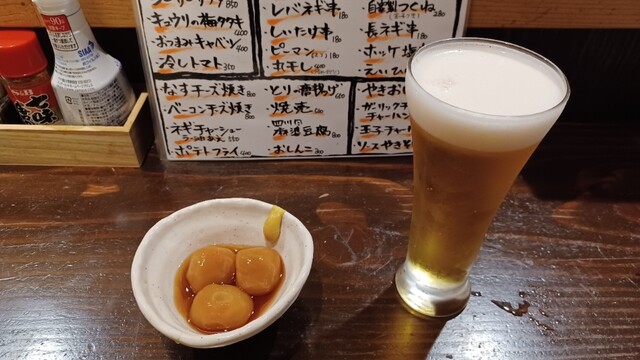 まずはグラスで生ビール、お通しは玉こん。