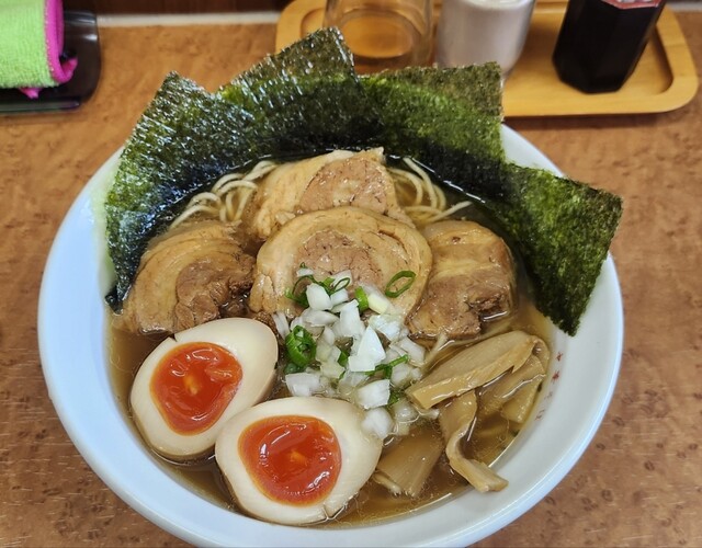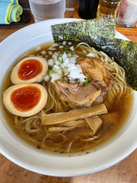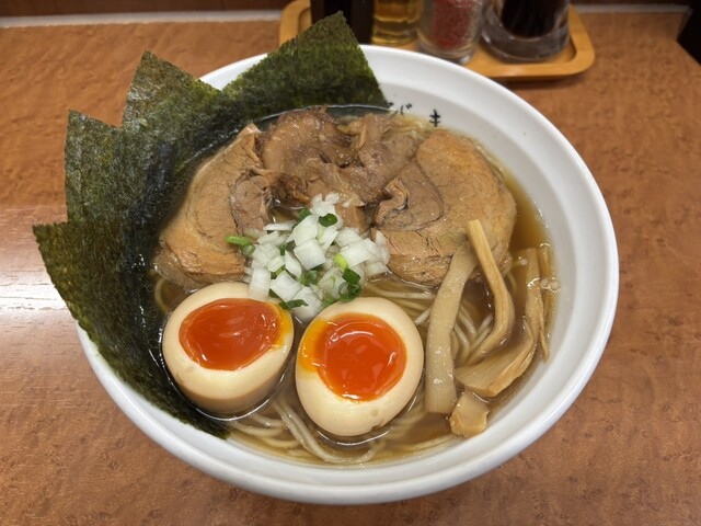 週末に中3息子とサシランチ。最寄りの北府中駅から徒歩30分、いちょう通り沿いに店舗を構える麺処。2010年オープン。青い看板が目印、渋さ満点の店構えからは想像もつかないような繊細で優しい味わいの中華そばが人気の地域愛され系ラーメン店。