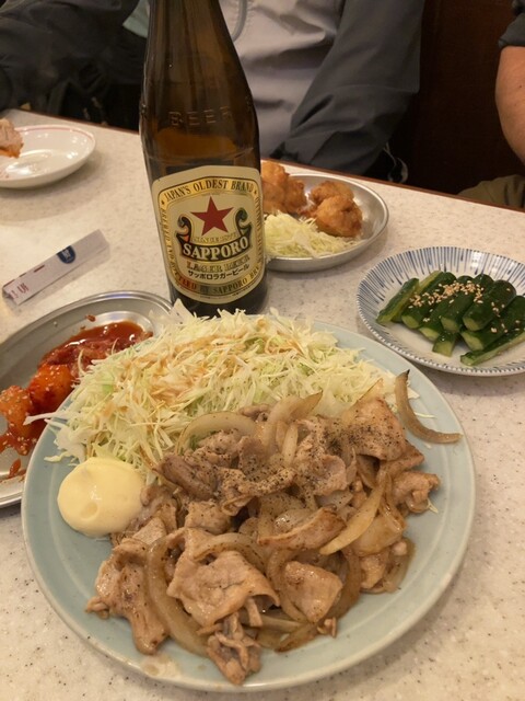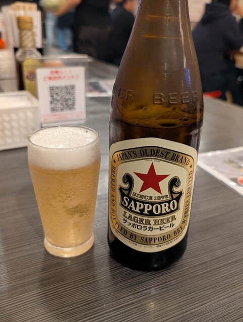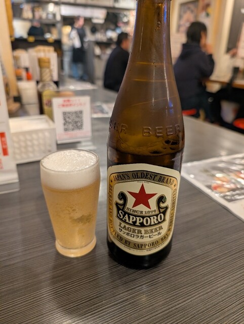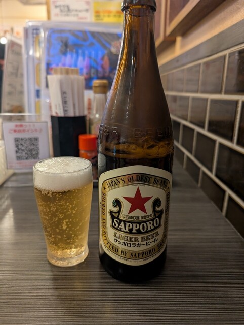 瓶ビール(サッポロラガー 赤星 中瓶 730円)で乾杯