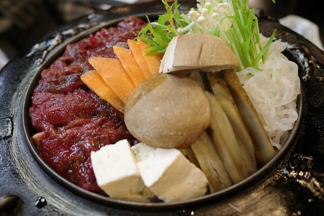 口の中でとろける様な食感は<肉鍋>や<馬刺し>をはじめ、