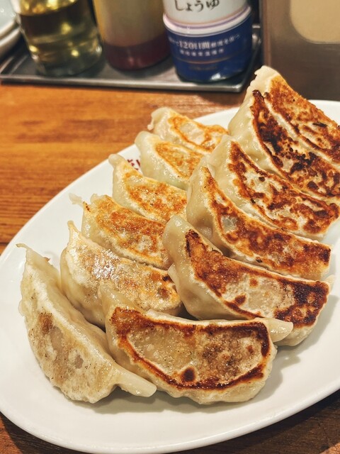まずは看板の餃子から。焼き目は香ばしく、皮はパリッと薄めで軽快な食感。餡は肉の旨味がしっかりしていて、ニンニクは控えめながらジューシーさがある。素の餃子は素材の味がストレートに伝わり、飽きずに食べられるタイプ。
