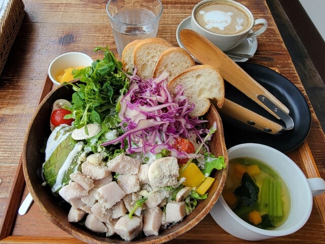 お昼は肉魚野菜をバランスよく摂れるランチセットやパワーサラダ。