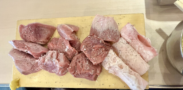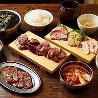 まずは 肉盛りが到着。4種類の部位が乗った 盛り合わせ。この厚切...
