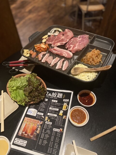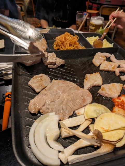 注文受ける前に決まっているセットが出てくるみたいで肉とかちょっとした野菜、キムチ、チーズ等が乗った鉄板を焼き始めたら、ス...