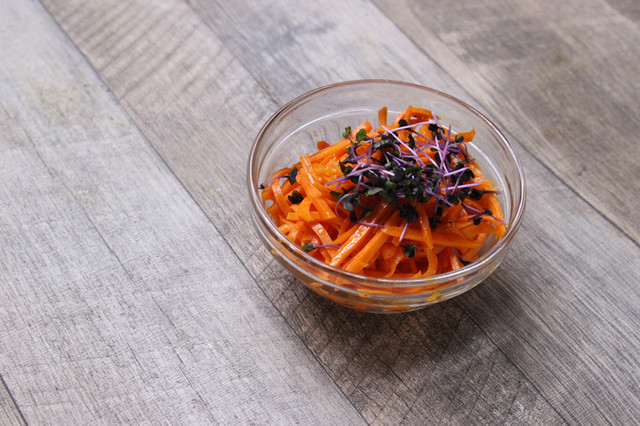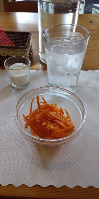最初に出てきたプチサイズのキャロットサラダは、ピクルスみたいな、ビネガーに漬けたみたいな千切りキャロットでした。太めの千...