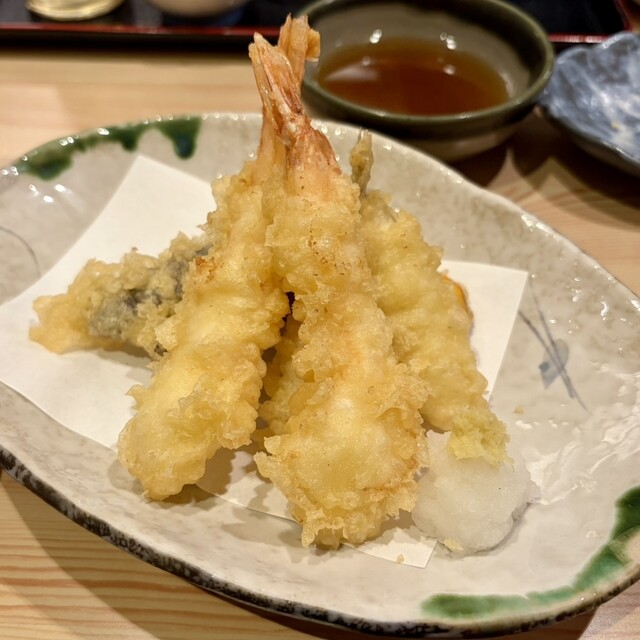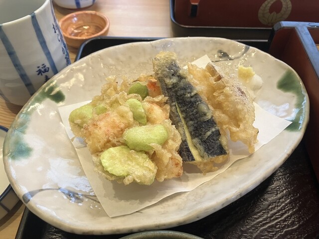 かき揚げはエビやそら豆などが入っていてとっても美味しい!茄子や茖荷、かぼちゃの天...