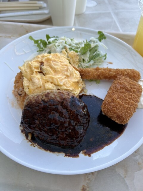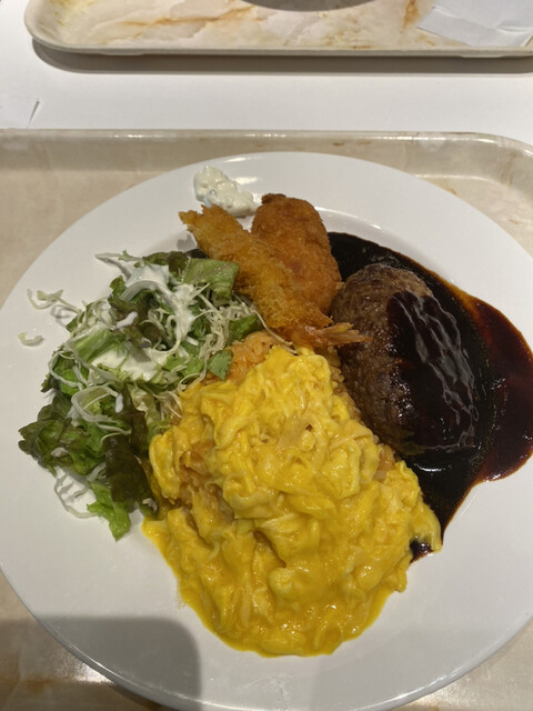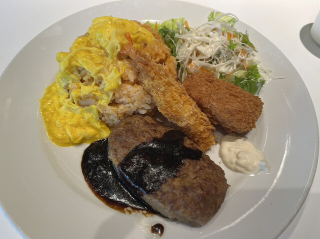 オムライス、ハンバーグ、エビフライ、カニクリームコロッケ、サラダのセット。ソースはデミグラスソース。大人の...