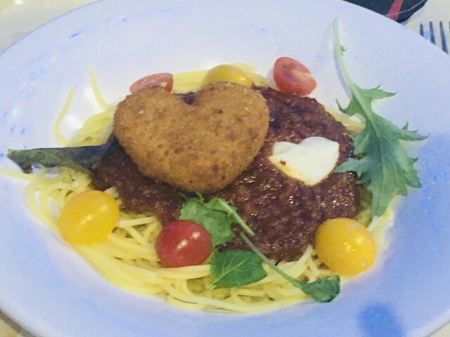 ちょうど夕飯時で、お腹も空いたので、期間限定のハート形のサツマイモコロッケが乗ったボロネーゼ、「ハートのラブ・ボロネーゼ」を注文。