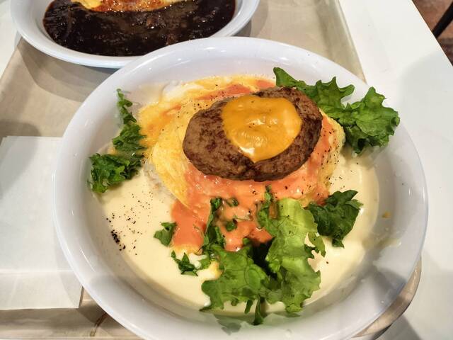 純白色(ホワイトソース)、ピンクダイヤモンド(オーロラソース)、イエローダイヤモンド(オムライス・チェダーチーズ)を使用したチーズハンバーグ&オ...